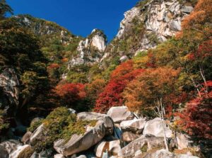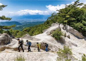 歴史の足跡をたどり自然の造形と大パノラマに息をのむ、日本有数の渓谷美を誇る昇仙峡登山道の一部は、かつて金峰山信仰の修験者たちが歩いた古道「御嶽道」と重なる。樹林帯の道には歌川広重が描いた奇岩や、炭焼窯跡が残り歴史を感じさせる。天を突くようにそそり立つ太刀の抜き石や、花崗岩と風化した白い砂が幻想的な風景をみせる白砂山など、登山道には絶景ポイントが多数ある。半球状の巨岩がスリルを感じさせる羅漢寺山の主峰・弥三郎岳からは富士山、金峰山、茅ヶ岳、八ヶ岳、南アルプスなど、ぐるり360 度の素晴らしい眺望が楽しめる。